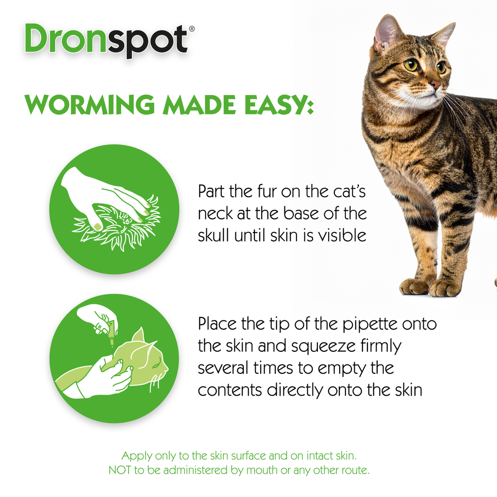 Worming your cat is made easy with Dronspot – a spot-on application that kills every type of intestinal worm commonly found in UK cats. Fuss-free deworming without tablets, gives you peace of mind that you are helping keep worms at bay from your pet and family.