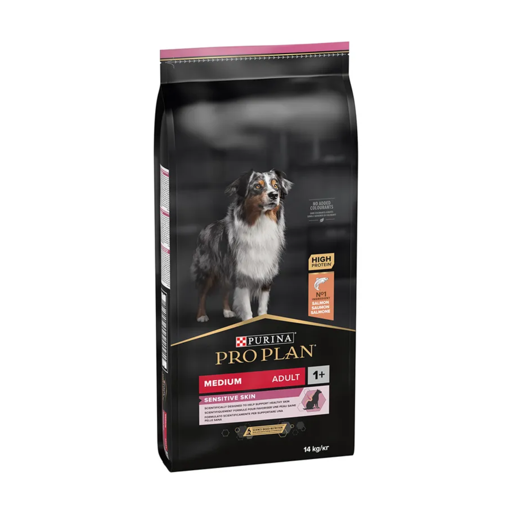 Purina PRO PLAN Sensitive Skin MEDIUM ADULT has been developed for adult dogs of medium breeds (10-25 kg weight). This dry dog food contains vitamin D, minerals and specific levels of omega-3 fatty acids to help support healthy teeth and gums. It is rich in high quality salmon and provides optimal nutrition for your medium dog's adventures from 12-15 months until 7 years of age, when you should transition to the Age Defence recipe.