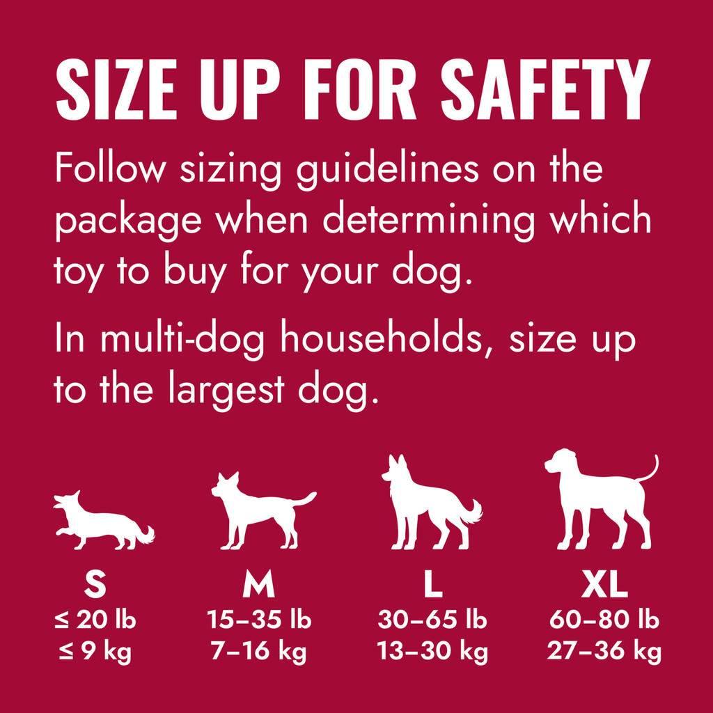 Warning: Pets should always be supervised when playing with toys. It is the owners responsibility to decide if this product is suitable for their pet. This toy is strong but not indestructible and will eventually become susceptible to chew damage. Examine regularly for wear and replace if any damage could represent a health hazard. Should small parts become loose, the toy should be removed and disposed of to prevent accidental swallowing.