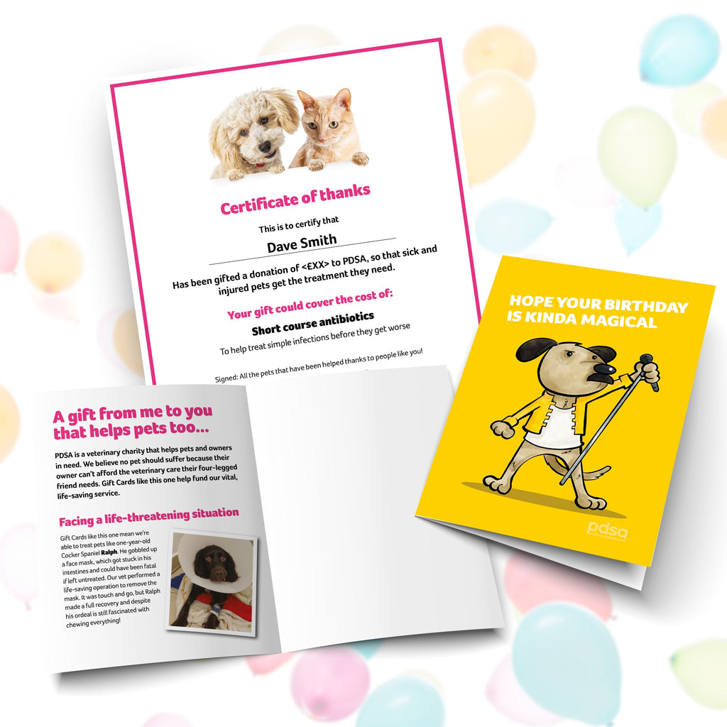 Give a gift with meaning and purchase one of our PDSA greeting cards today. In buying a card you’ll not only be purchasing a great gift for a loved one but you will also help to provide vital care for sick and injured pets.