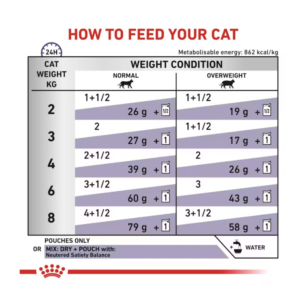 Please ensure you follow the correct rationing amount, especially when mix-feeding. Mixed feeding possibilities - To cater to each cat's individual preferences, a similar dry food product called ROYAL CANIN® Neutered Satiety Balance is also available. Mixed feeding gives your cat a variety of textures, helping to stimulate their appetite.