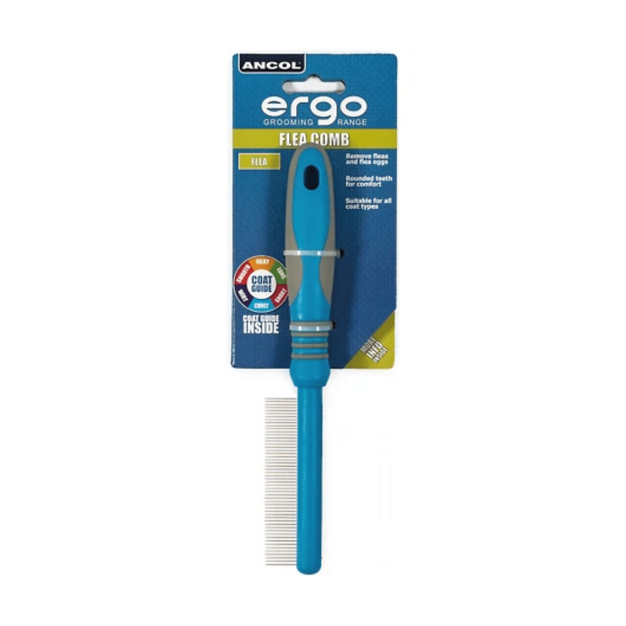 The Ancol Ergo Flea Comb has an ergonomic handle and fine, rounded stainless steel teeth designed to safely remove fleas, flea eggs, and debris from pet coats without scratching the skin, suitable for all coat types (though longer coats need detangling first) and great for bonding and checking for parasites. Key features include comfort for the pet and owner, effectiveness in trapping pests, and ease of cleaning, making it a staple for flea detection and removal.