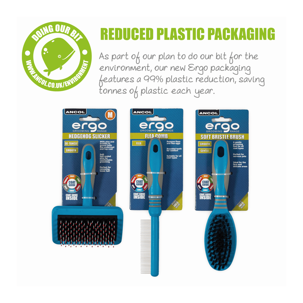 The Ergo Medium comb is a dog grooming tool designed for detangling and smoothing long, wiry, silky, and curly coats. It features an ergonomic handle and rounded stainless steel teeth to ensure a comfortable experience for both pet and owner.