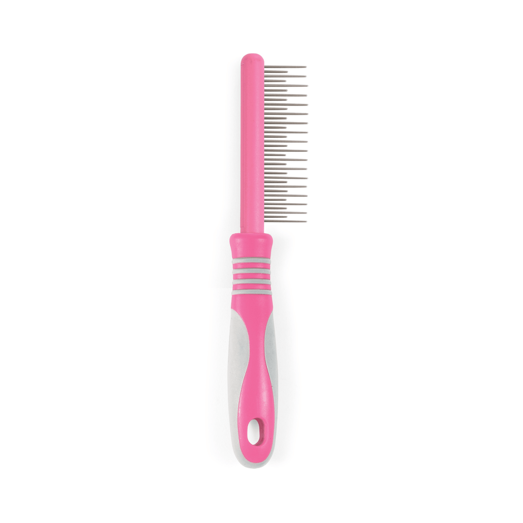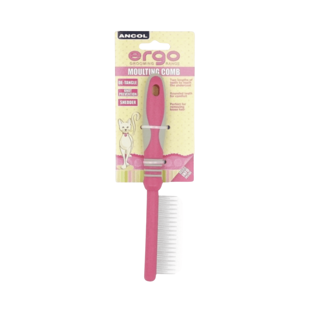 The Ancol Ergo Moulting Comb has two lengths of teeth to help remove loose hair from the undercoat and top coat, particularly useful when your cat is shedding. The medical quality stainless steel pins are rounded at the ends to prevent discomfort and be gentle on your cat's skin.