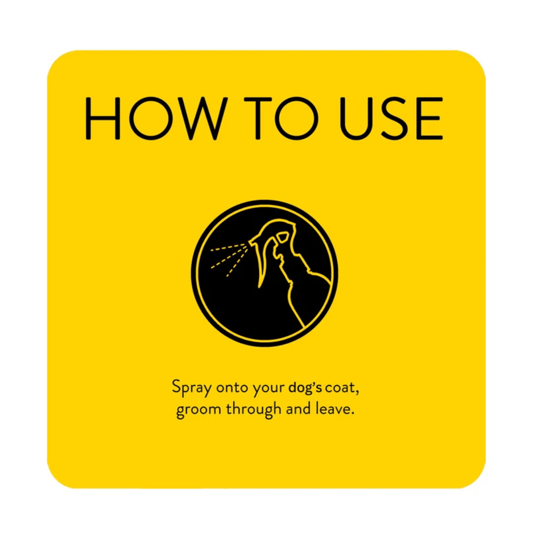 Directions for use: Spray onto your dog’s coat, groom through and leave. Avoid contact with eyes. If this occurs rinse with water. Keep out of reach of children.