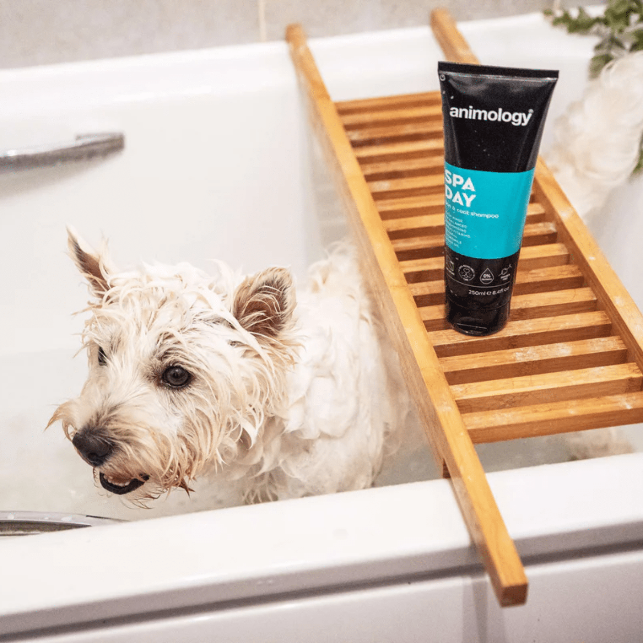 Spa Day by Animology, is a luxurious shampoo that cares for your dog's skin and coat. Enriched with Oatmeal, Chamomile and Argan Oil with built-in vitamins and conditioners, it helps improve the natural shine and softness of the fur and soothes skin. Spa Day can be used on all coat and skin types and is suitable for all dogs from 6 weeks old.