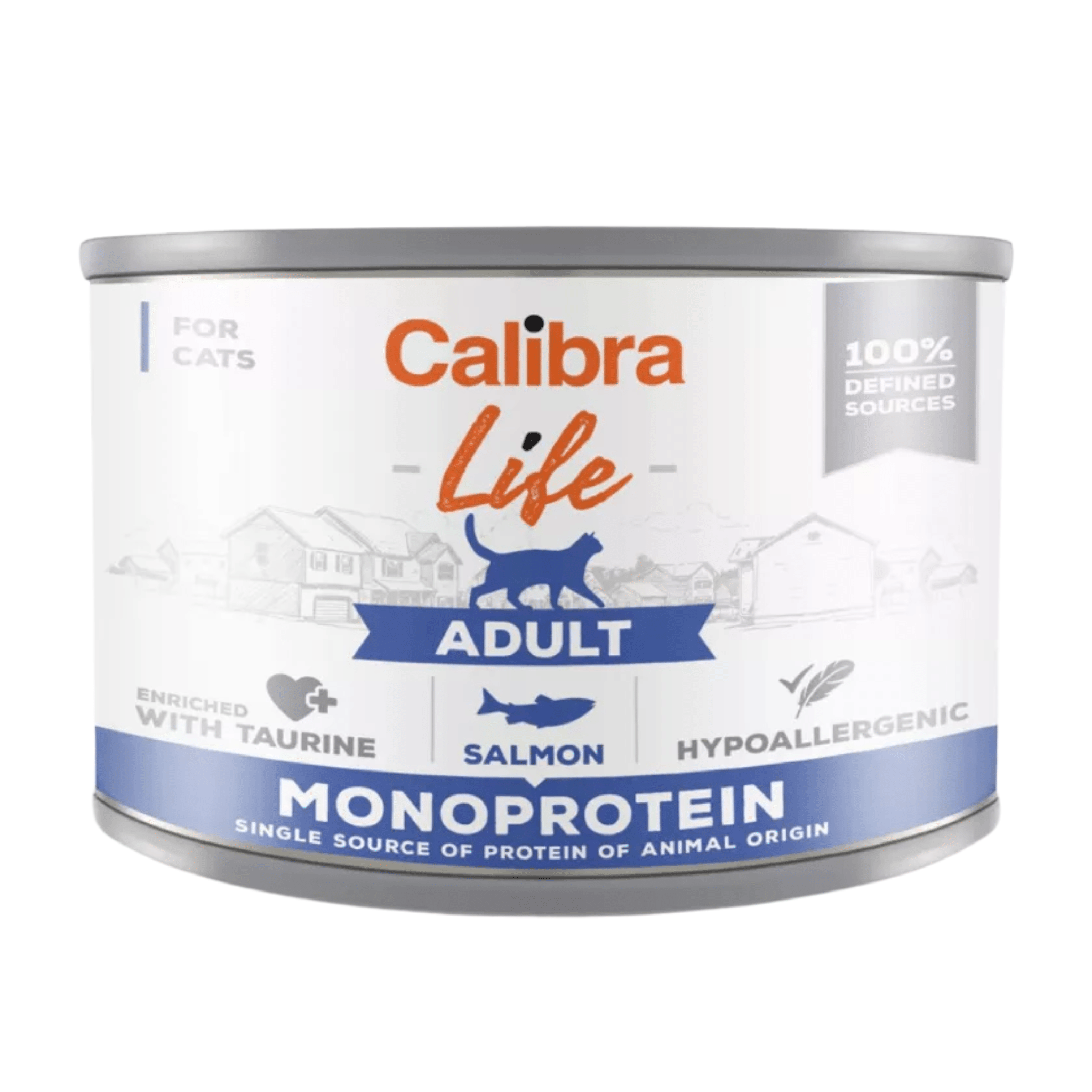 Calibra Cat Life Adult Salmon - This canned food recipe with salmon is designed for adult cats. This complete wet food is based on a single type of protein; the hypoallergenic recipe is formulated with a limited number of ingredients. The canned food formula is grain- and gluten-free, which has a positive effect on its excellent digestibility. It contains only 100% defined ingredients of the highest quality.