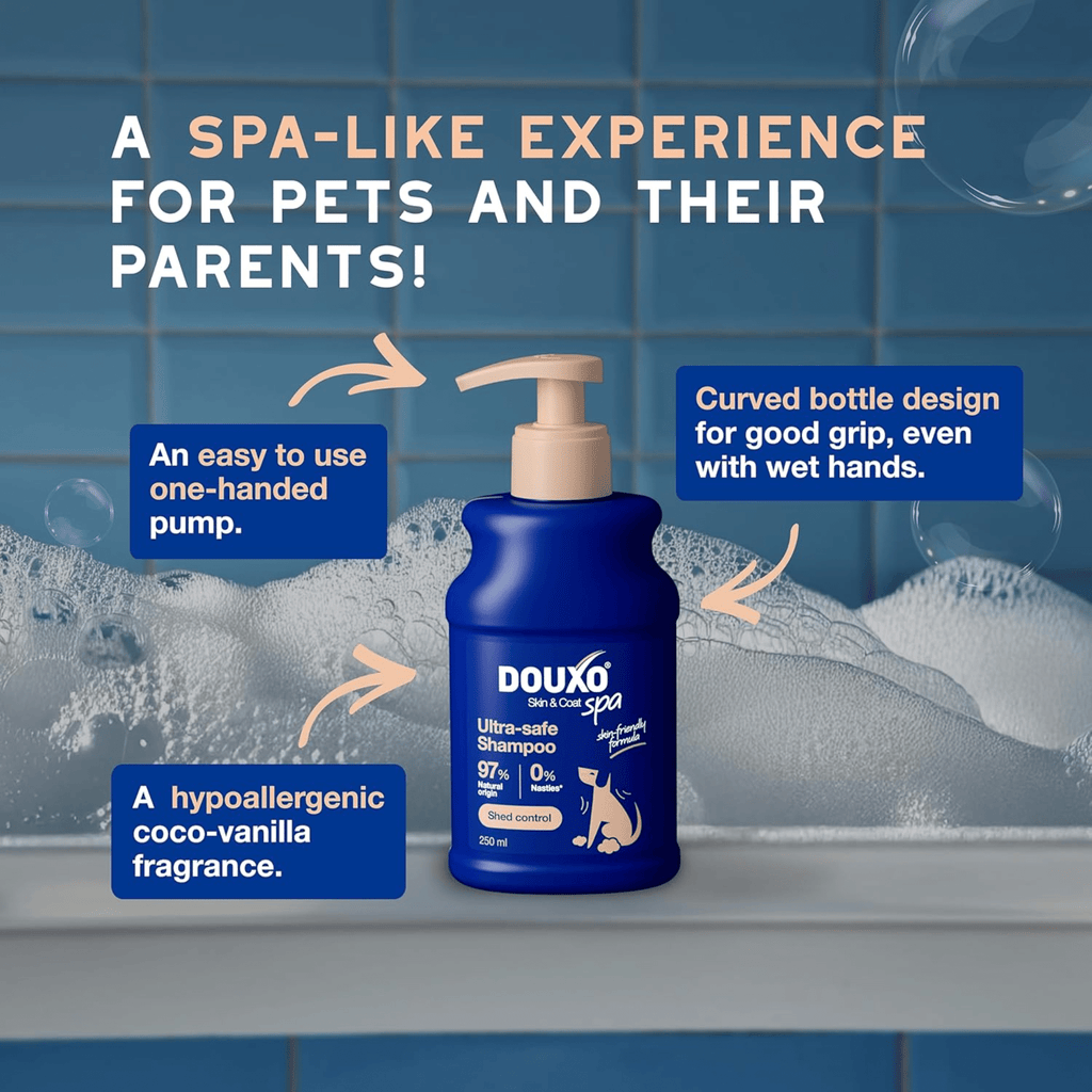 A dog’s skin is as delicate as a baby’s. It deserves consistent care with ultra-safe products that are as gentle as baby shampoo. DOUXO® SPA Shed Control Shampoo gently cleanses and hydrates the skin, helps reduce excessive shedding, and removes flakes — all while respecting your dog’s sensitive skin and coat.
