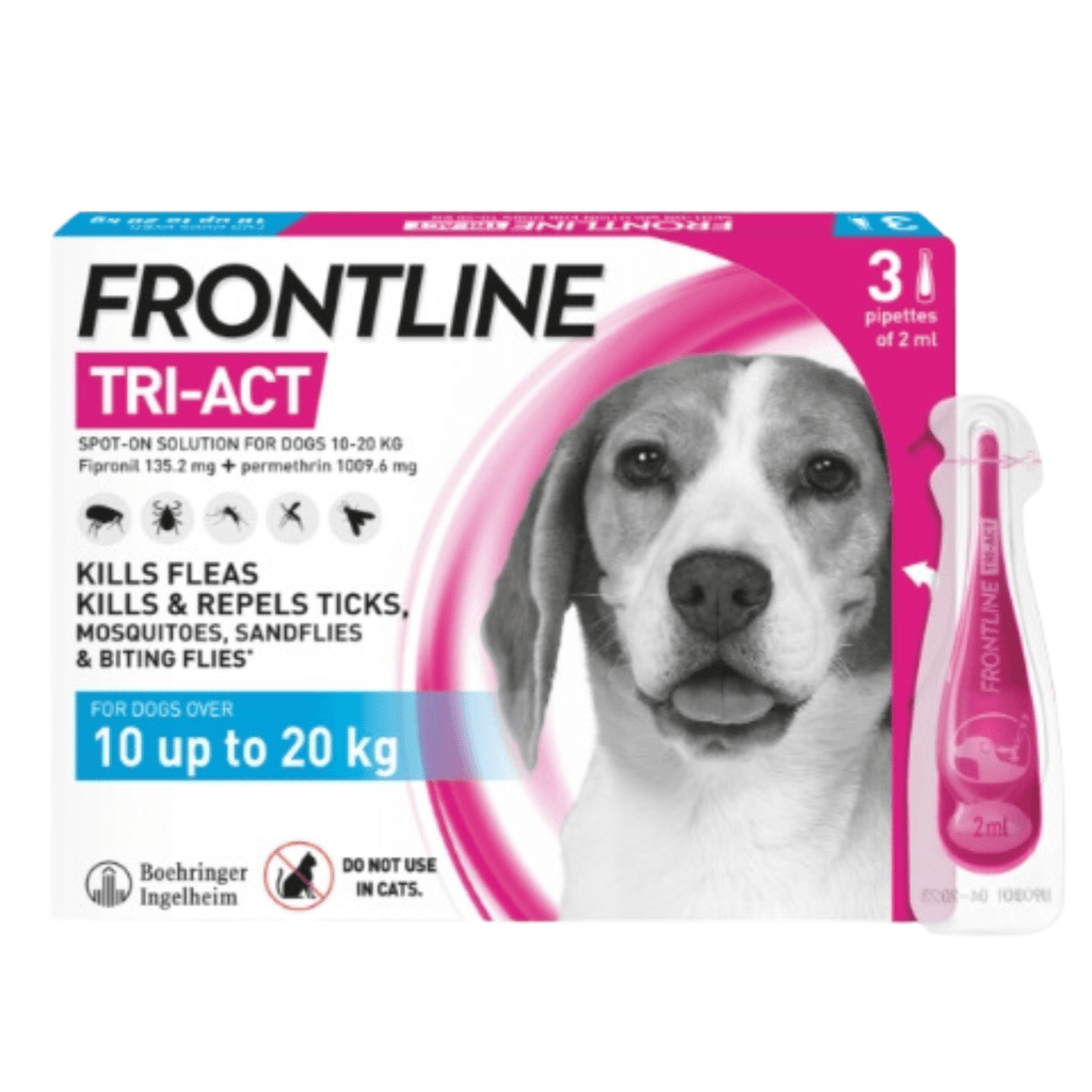 FRONTLINE TRI-ACT® has a unique formula that kills faster and repels more disease-carrying parasites than the next leading competitor brand. Used every 4 weeks, it’s the next level in parasite control for dogs, providing long-lasting protection against flying insects as well as fleas and ticks, while also preventing home flea infestations. FRONTLINE TRI-ACT® FOR DOGS helps to keep your dog active, healthy and happy by working against a range of common UK parasites that can transmit diseases or cause irritation to your dog.