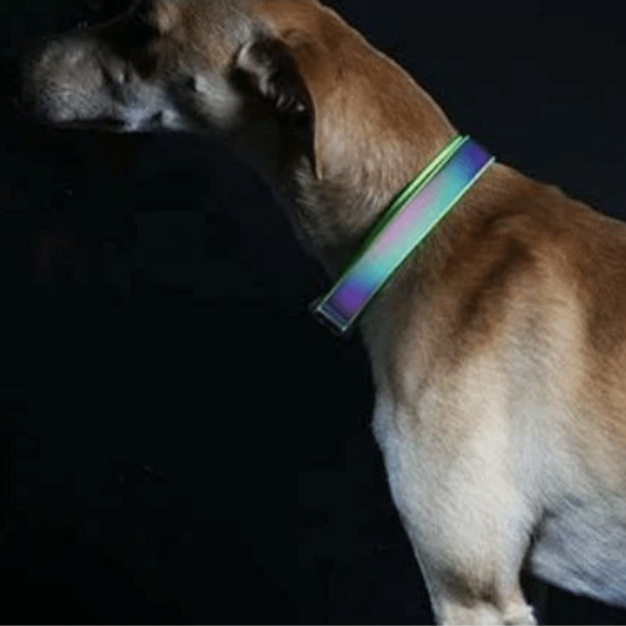This collar reflects rainbow colours when illuminated in dark conditions. It also features an LED flashing buckle with three light settings: Pulse Flash, Random Flash, and Light On.