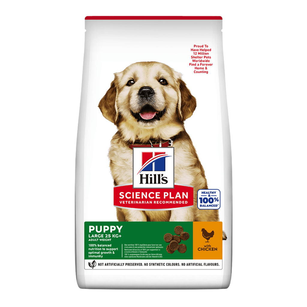 Hill's Science Plan Large Breed Puppy food with Chicken is specially made with an optimal level of calcium for controlled bone growth, a unique developmental need of large breed puppies. Give them the best start in life so they can grow to their full potential.