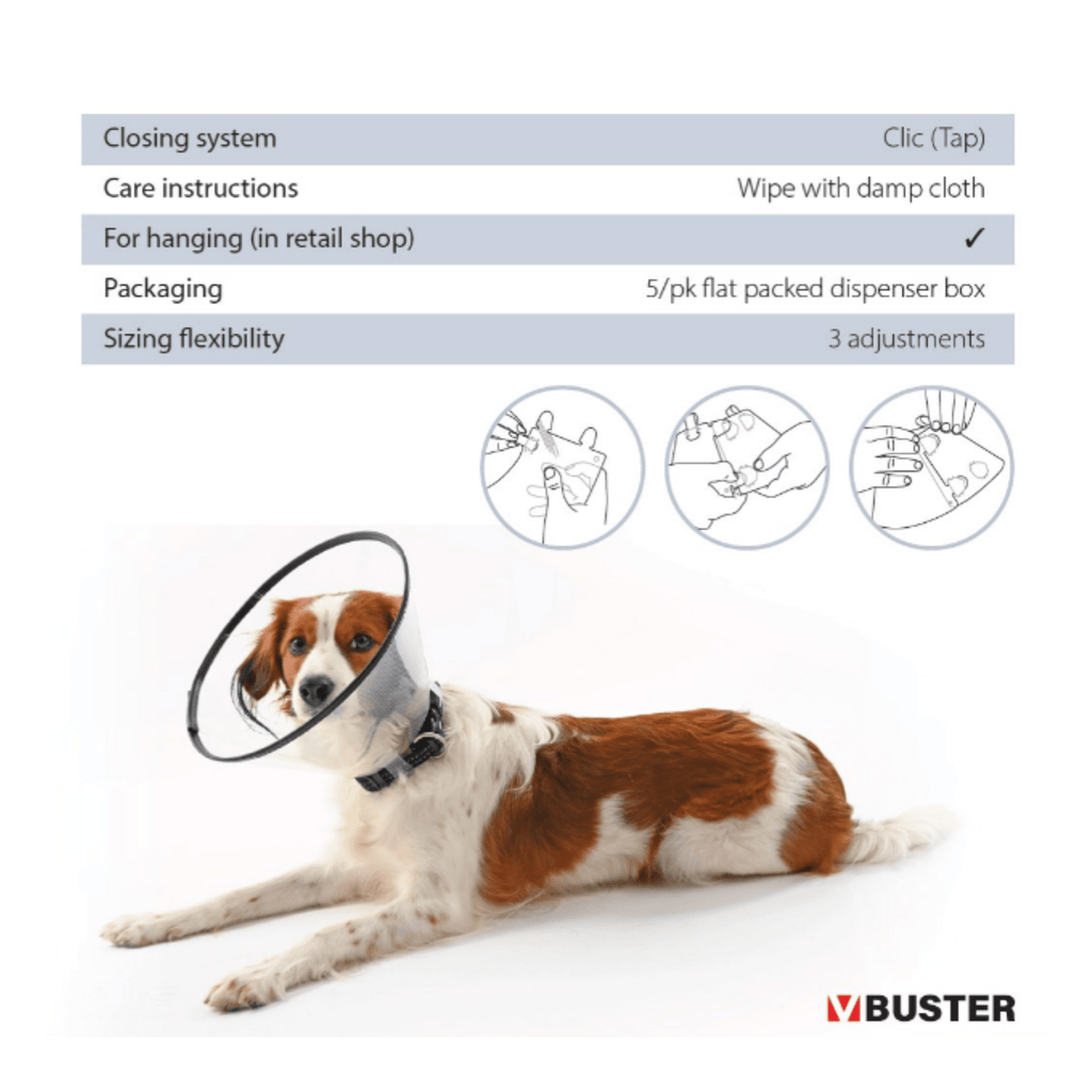 BUSTER Comfort Collar has a soft rubber edge - equipped with a new quick-fastening system which can be attached to your pet's collar. The collar is transparent which enables the animal to see through it.