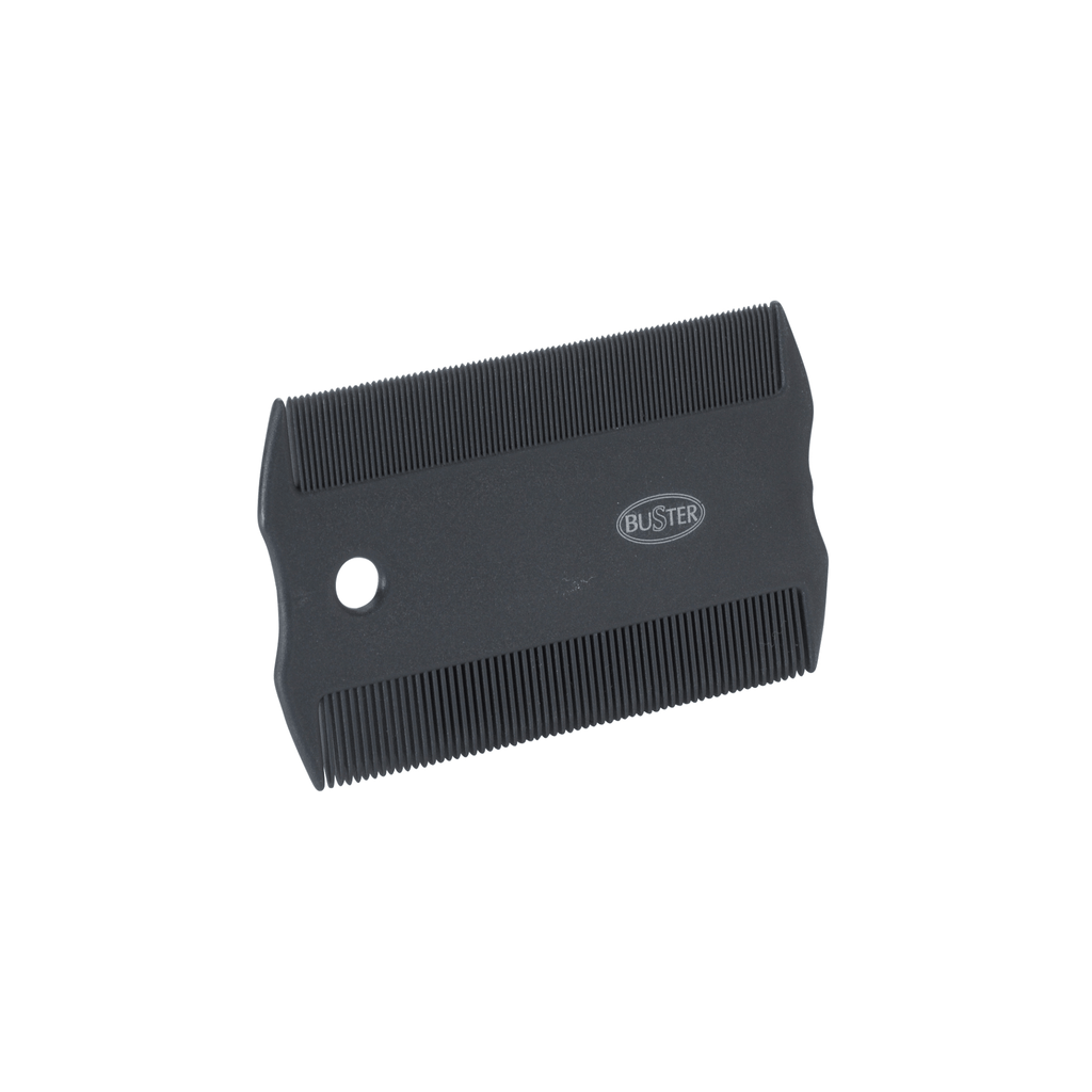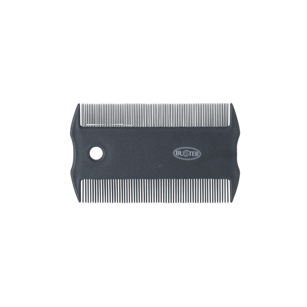 A BUSTER flea comb is a durable grooming tool with plastic teeth for combing through both cat and dog coats. Designed to physically remove fleas, their eggs, larvae, and debris (flea dirt) from pet fur without chemicals. Working for all coat types, including sensitive areas like the face, making it great for both flea treatment and hygiene.