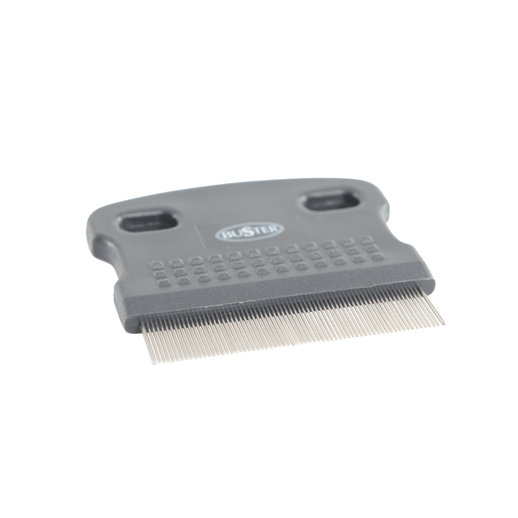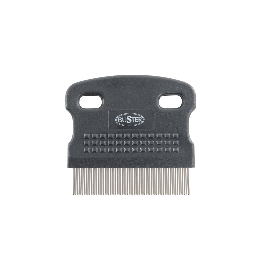 A BUSTER flea comb is a durable grooming tool with metal teeth for combing through both cat and dog coats. Designed to physically remove fleas, their eggs, larvae, and debris (flea dirt) from pet fur without chemicals. Working for all coat types, including sensitive areas like the face, making it great for both flea treatment and hygiene.