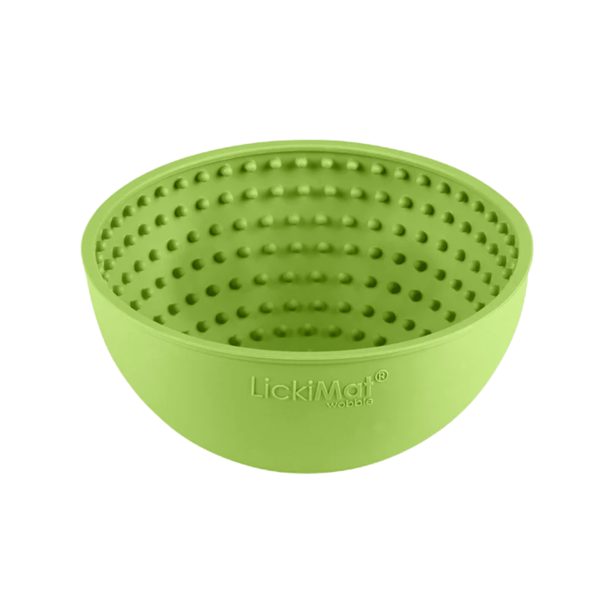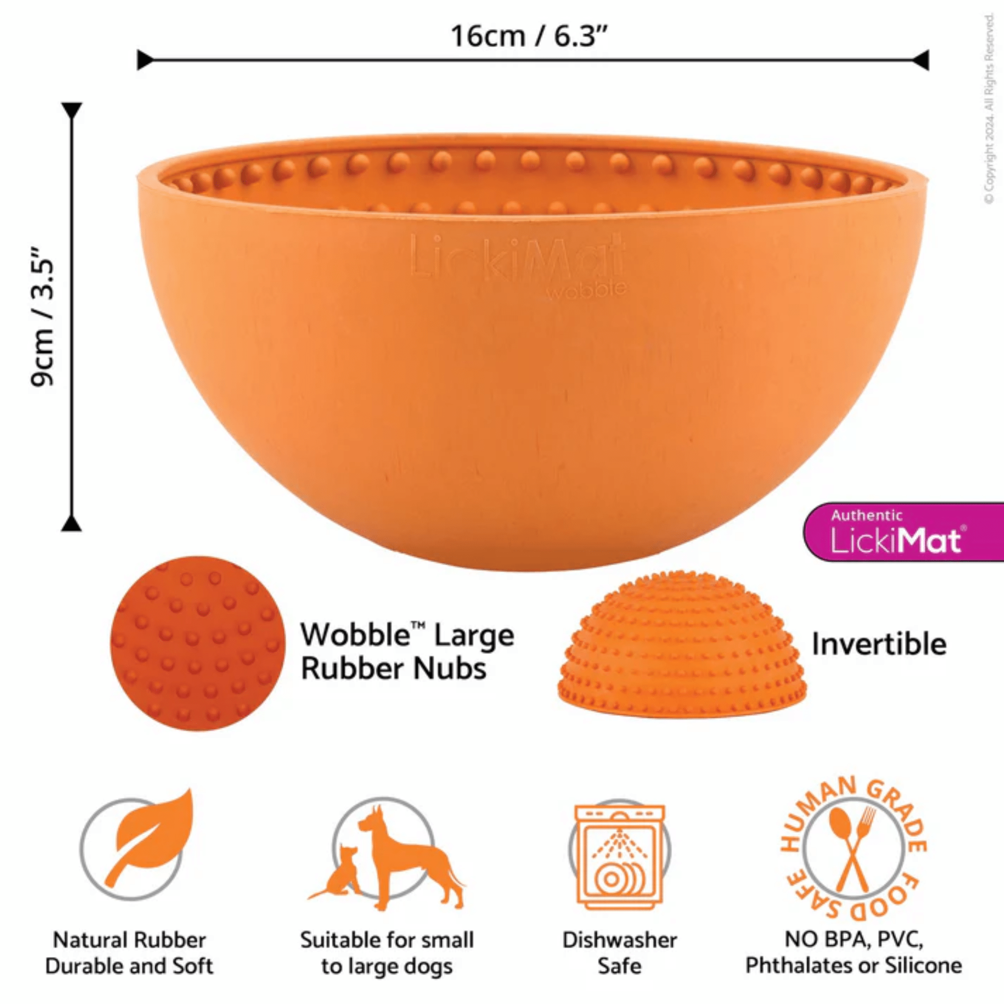The LickiMat® Wobble™ is a fun, reversible slow feeder bowl for dogs that reduces boredom, eases anxiety, and promotes healthier feeding.