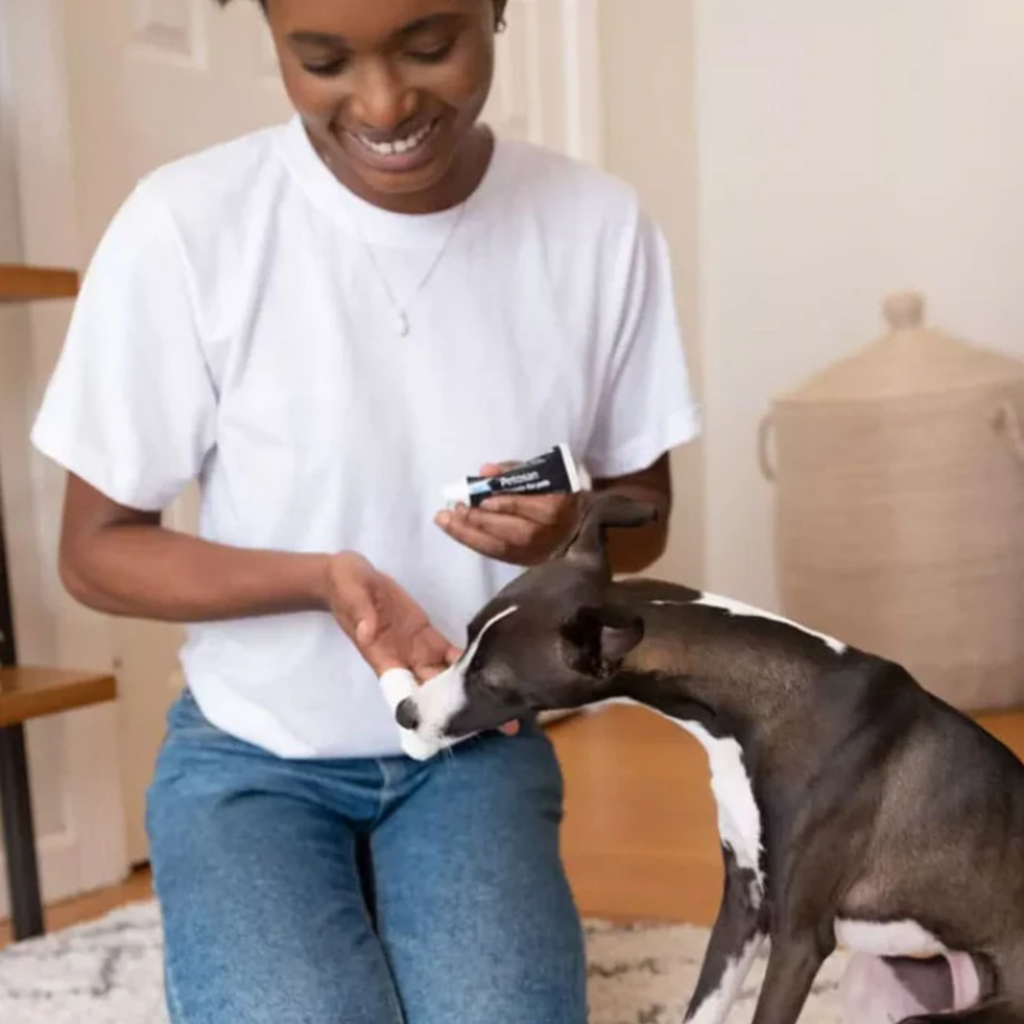 Pets get a quick tooth cleaning with the Petosan® Microfiber Fingerbrush Oral Dog & Cat Cleaner.