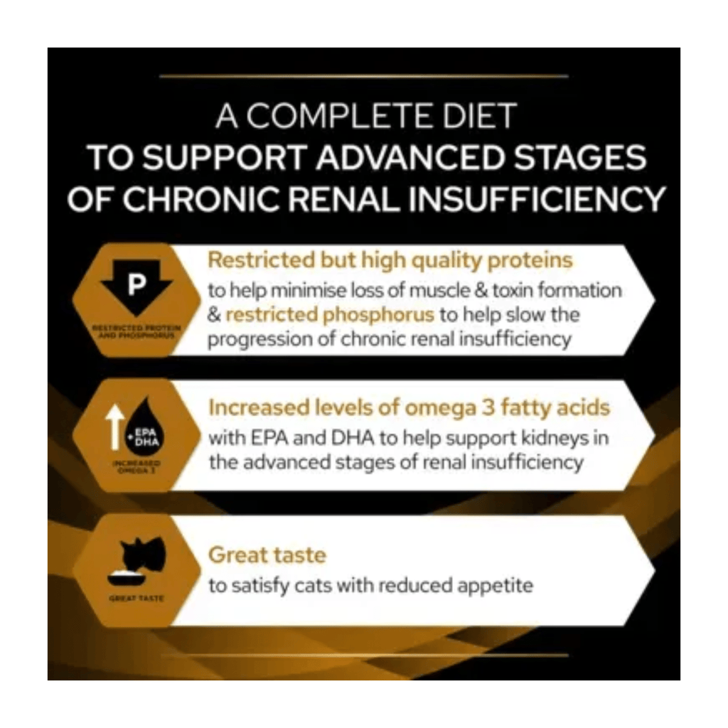Complete dietetic pet food for adult cats for the support of renal function in case of advanced stages of feline chronic renal insufficiency (CRI).