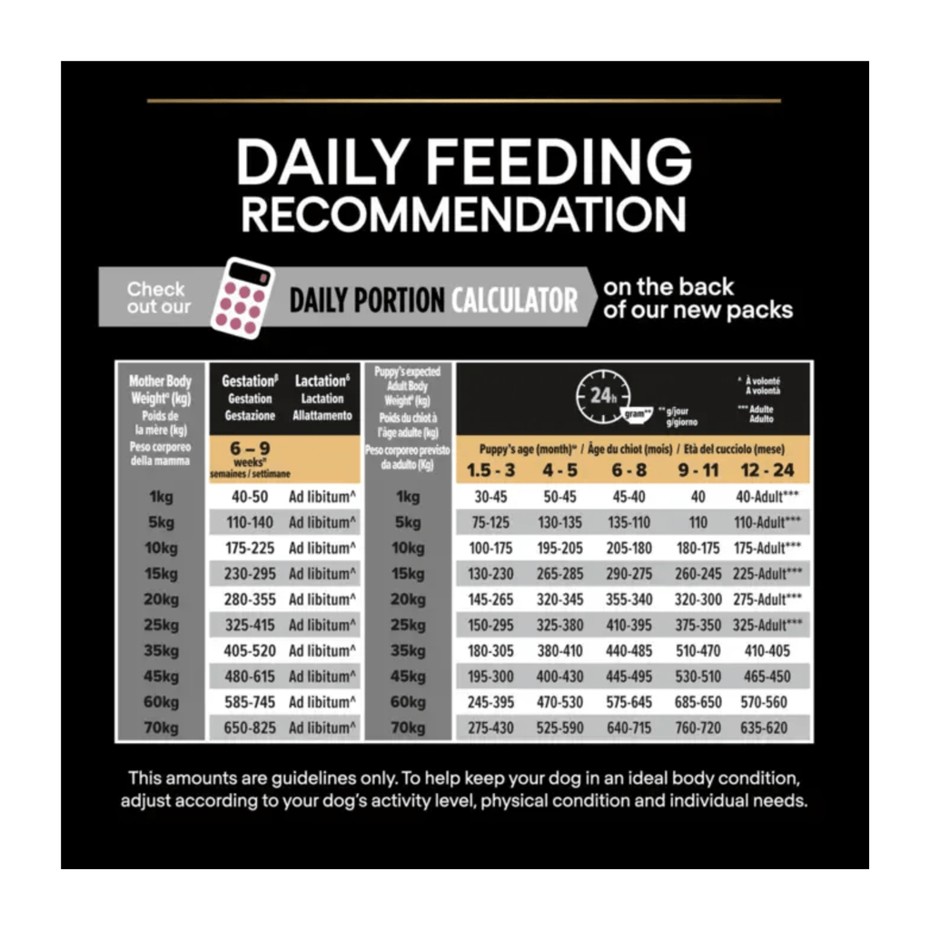 Feeding Guide: See table for recommended daily feeding amounts. These amounts are guidelines only. To help keep your dog in an ideal body condition, adjust according to your dog’s activity level, physical condition and individual needs. Clean, fresh water should be available at all times. To monitor your dog’s health, consult a veterinary surgeon regularly.