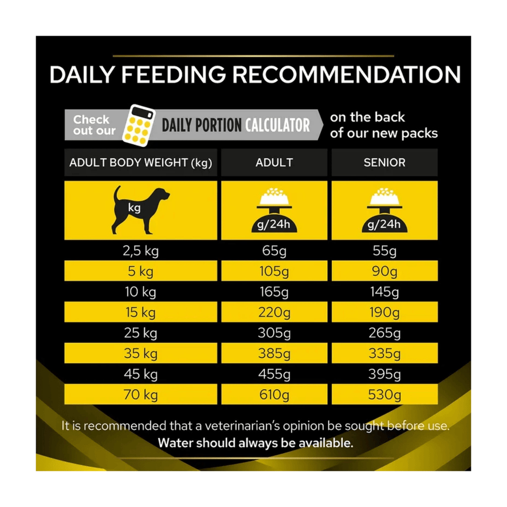 Feeding Guide: Ensure your dog maintain a lean body condition by adjusting the daily amounts according to your dog’s activity level, physical condition and individual needs. To monitor your dog’s health, consult a vet regularly. Fresh, clean water should be available at all times.