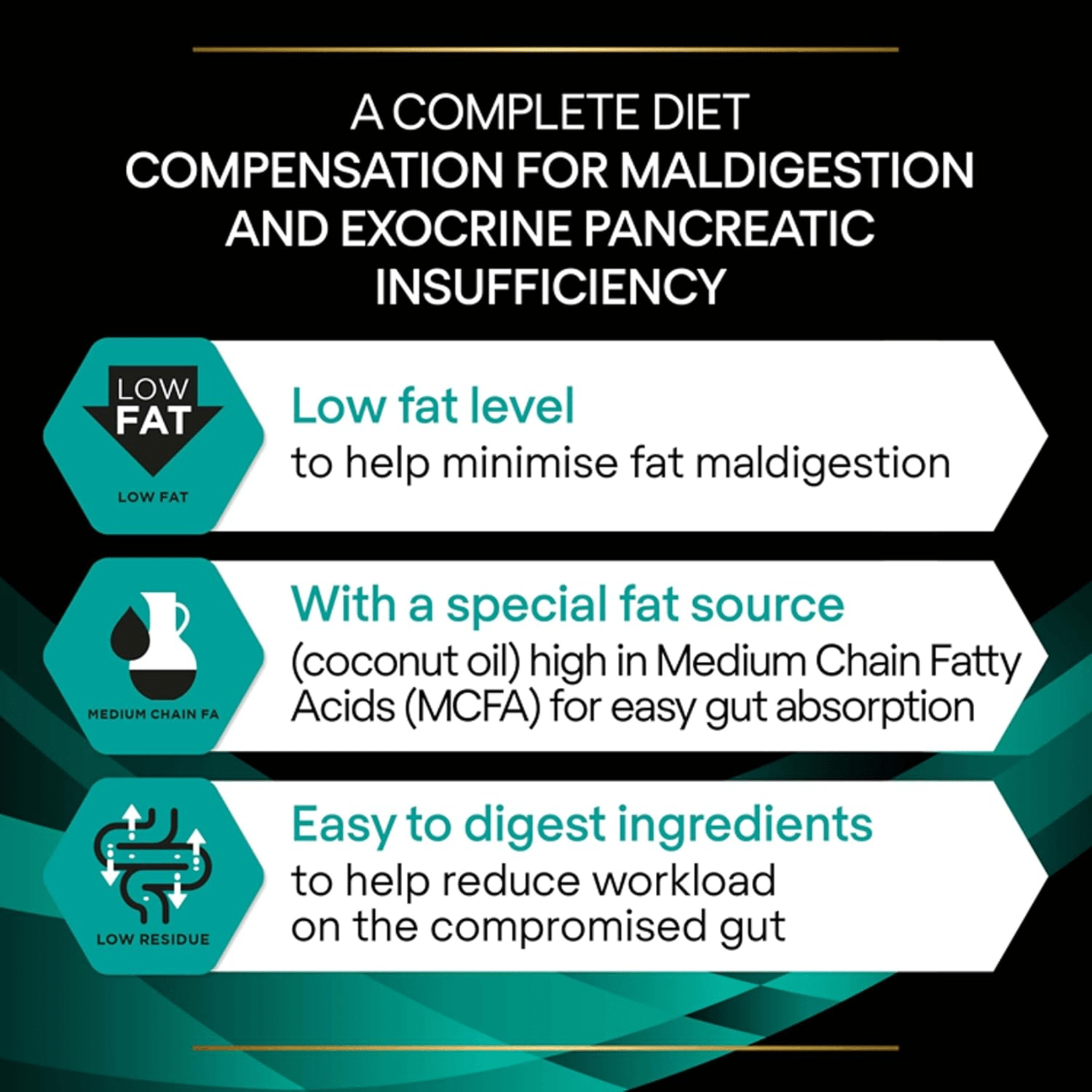 Low fat. Help minimise fat maldigestion. MCFAs with a special fat source (coconut oil) high in Medium Chain Fatty Acids (MCFAs) for easy gut digestion and absorption. Highly digestible ingredients to help promote high nutrient absorption and reduce workload on the compromised gut. Improves microbial balance, stimulates the growth of beneficial bacteria and provides short-chain fatty acids for the enterocytes.