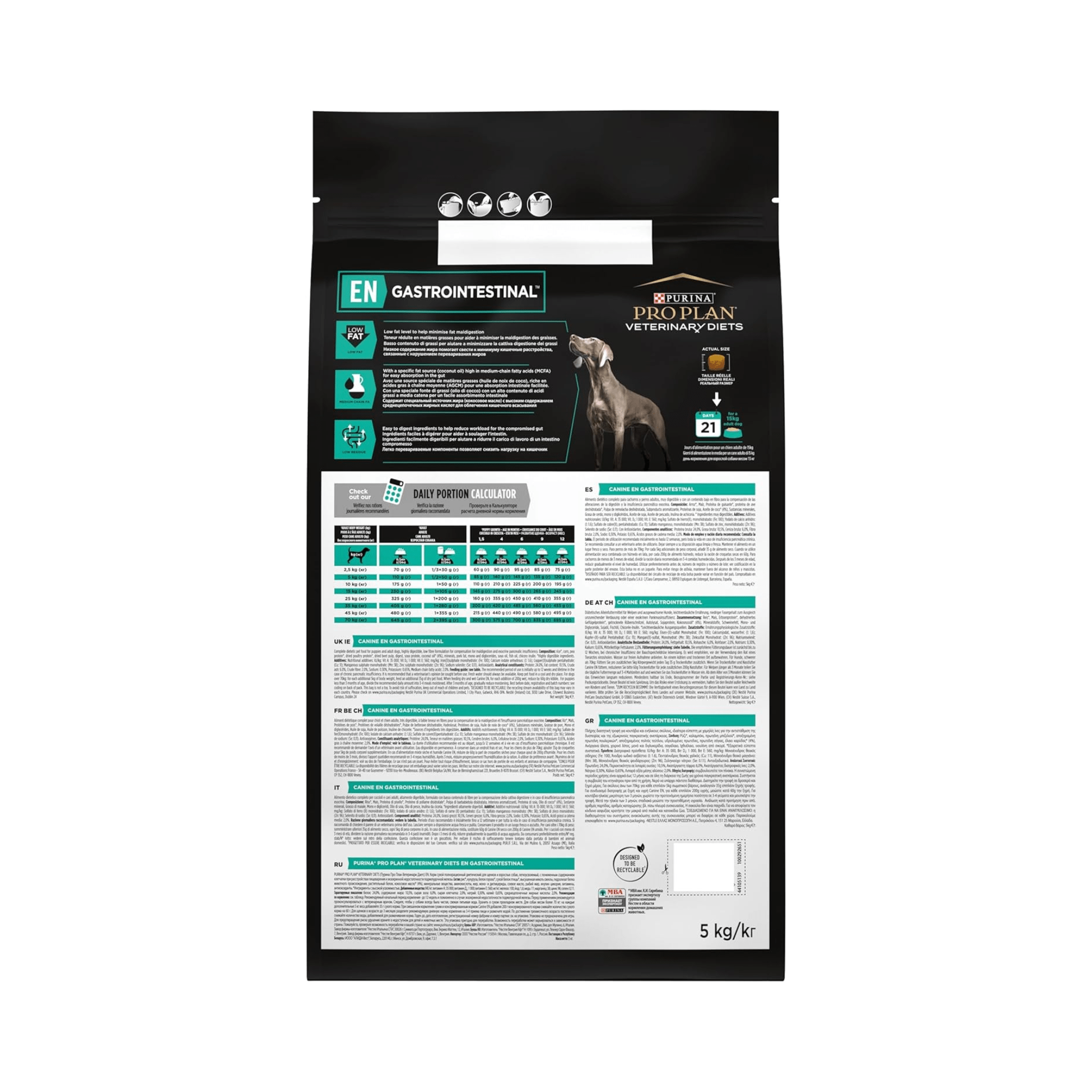 The recommended period of use is initially up to 12 weeks and lifetime in the case of chronic pancreatic insufficiency. It is recommended that a veterinarian’s opinion be sought before use. Water should always be available. For dogs over 70kg: for each additional 5kg of body weight, feed an additional 35g of dry pet food. When feeding dry and wet Canine EN, for each addition of 200g wet, reduce by 60g dry kibble. For puppies less than 3 months of age, divide the recommended daily amount into 3-4 meals moistened. After 3 months of age, gradually reduce moistening. For 1.5kg: For puppies, consult your veterinarian on recommended feeding guidelines.