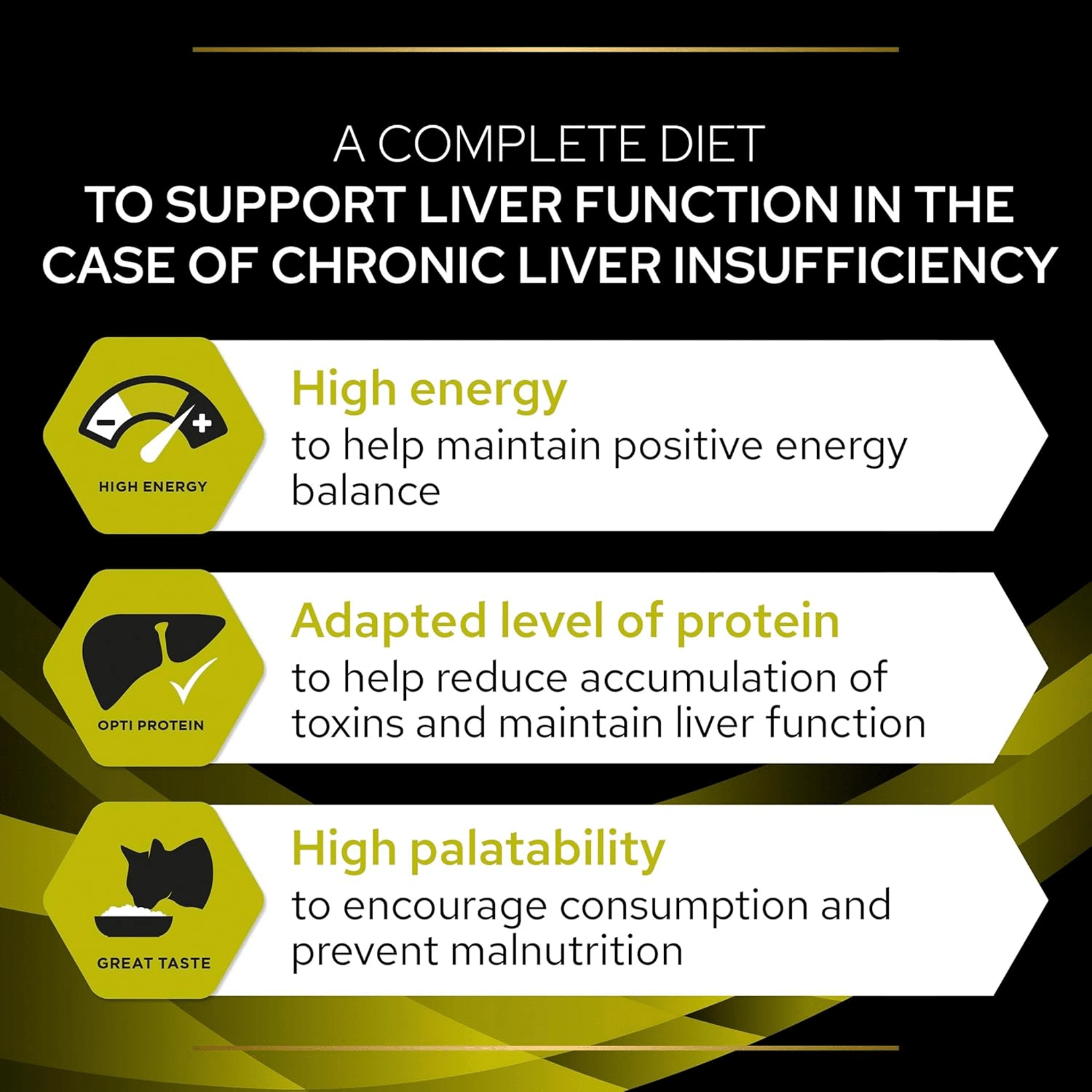 High energy content to help maintain a positive energy balance. Adapted level of protein to help maintain body weight, reduce toxin accumulation and maintain liver function. High palatability to encourage consumption and prevent malnutrition.