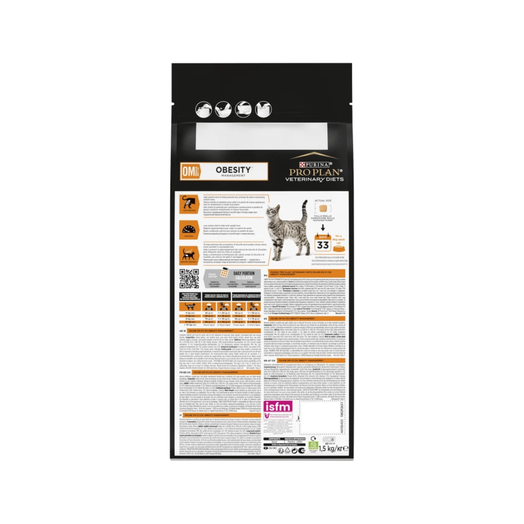The suggested daily food intake for weight loss is based on the cat’s current weight, average caloric requirements and a desired weight loss of 1% of body weight per week. Daily food intake should be adjusted every 2-4 weeks after reweighing. PURINA PRO PLAN VETERINARY DIETS OM Obesity Management should be fed for the duration of weight loss until target weight is reached, but can also be fed long term for cats prone to weight gain using the maintenance feeding quantities to minimise the risk of rebound weight gain.