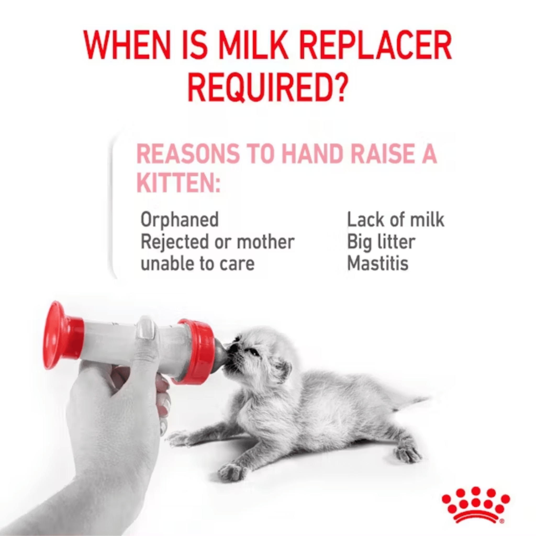 Suitable for first age kittens from birth to weaning, ROYAL CANIN® Babycat Milk is specially formulated to feed kittens in case of insufficiency or poor quality of the mother’s milk. Its formulation is as close as possible to the mother’s milk.