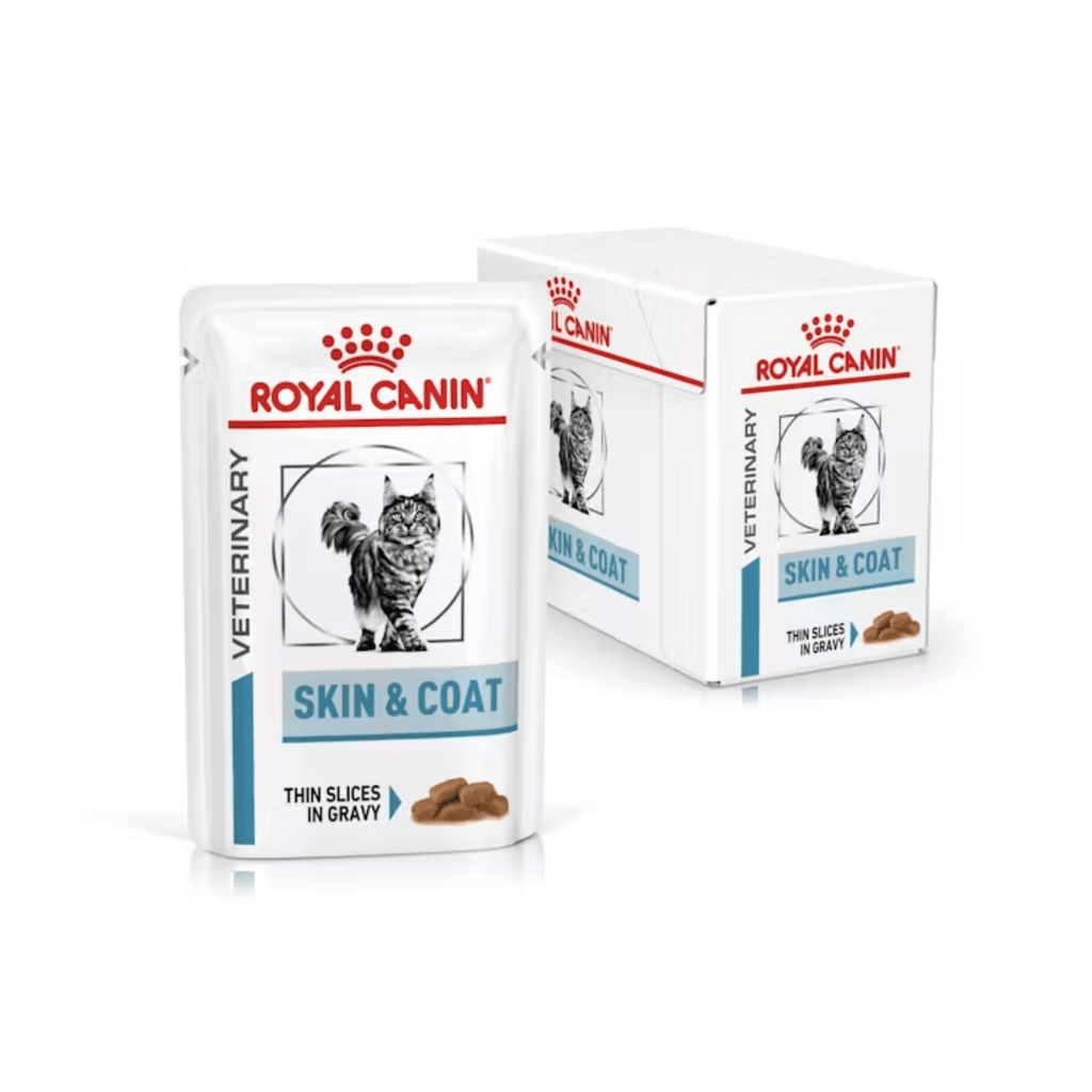 - Skin & coat - ROYAL CANIN® Skin & Coat (thin slices in gravy) is enriched with omega-3 fatty acids (EPA and DHA) to help support healthy, nourished skin and a shiny coat.