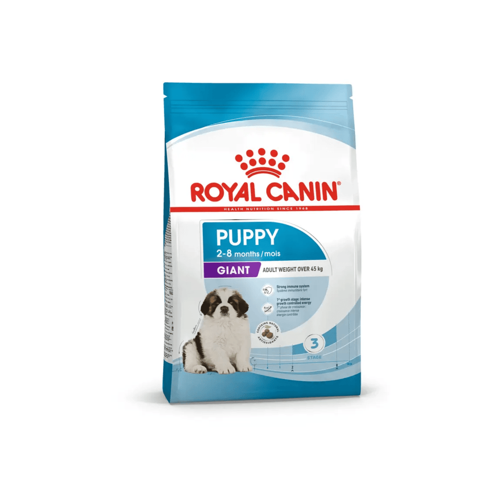 ROYAL CANIN® Giant Puppy contains tailored nutrients to support your giant-breed puppy's intense growth period between 2 and 8 months and helps to limit excess weight gain. This formula contains nutrients such as vitamins C and E to help support the puppies' natural defences while their immune systems are still developing. Extra-large dogs have sensitive digestive systems and may be prone to diarrhoea and flatulence. A combination of beneficial prebiotics (such as FOS, MOS and beet pulp) and highly digestible proteins, helps to support a healthy balance of intestinal microbiota (gut flora) for good digestion. Additionally, the formula has precise levels of minerals, including calcium and phosphorus, to support the development of rapidly growing bones.