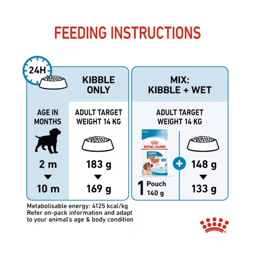 ROYAL CANIN® Medium Puppy is specially formulated to support the nutritional needs of medium-sized puppies. This formula is suitable for 2 to 12-month-old puppies that should reach an adult weight of 11-25kg. This formula contains nutrients such as vitamins C and E to help support the puppies' natural defences while their immune systems are still developing. It is enriched with omega-3 fatty acids (such as DHA) which help to support healthy brain development in puppies.