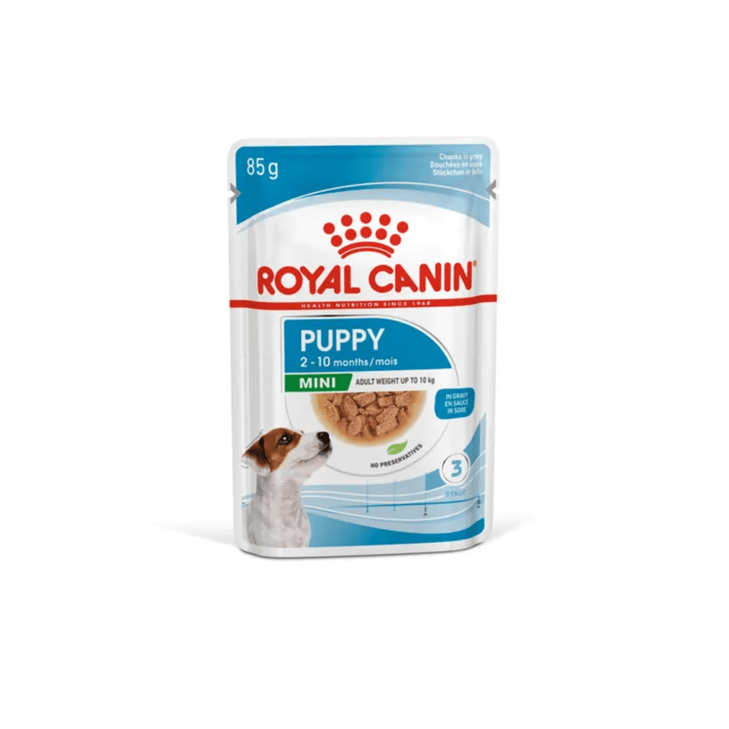 ROYAL CANIN® Mini Puppy in Gravy is specially formulated to support the nutritional needs of small breed puppies. This formula is suitable for 2 to 10-month-old puppies that should reach an adult weight of 4-10kg. This tailored diet contains appetising chunks in gravy, designed with a size, texture and taste that's perfect for small breed, growing puppies. This formula contains nutrients such as vitamins C and E to help support the puppies' natural defences while their immune systems are still developing. The formula is also enriched with omega-3 fatty acids (such as DHA) to help support healthy brain development in puppies.