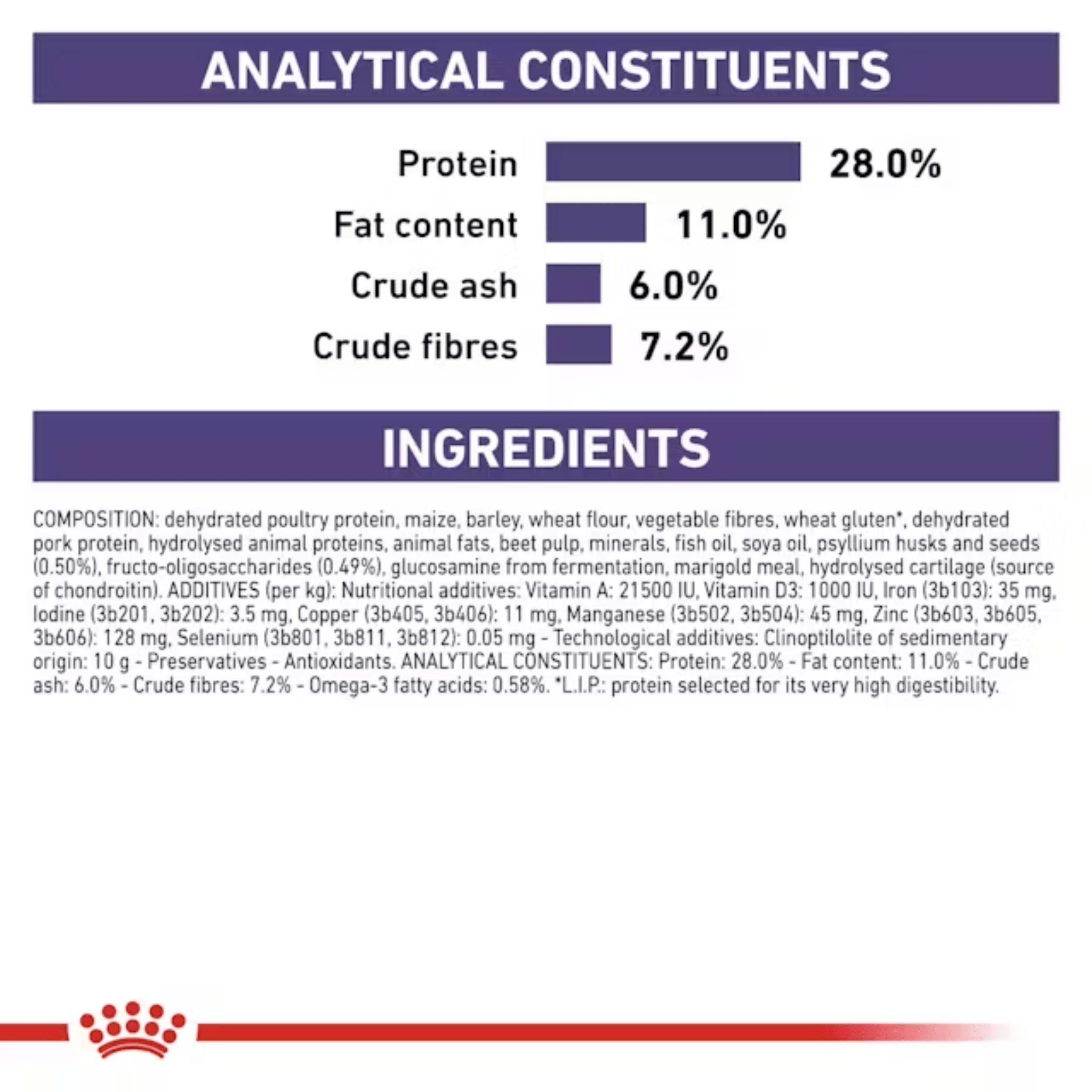 Composition: Barley, maize, dehydrated pork protein, dehydrated poultry protein, wheat flour, vegetable fibres, wheat gluten*, hydrolysed animal proteins, animal fats, minerals, chicory pulp, fish oil, soya oil, psyllium husks and seeds (0.5%), fructo-oligo-saccharides (0.49%), marigold meal.