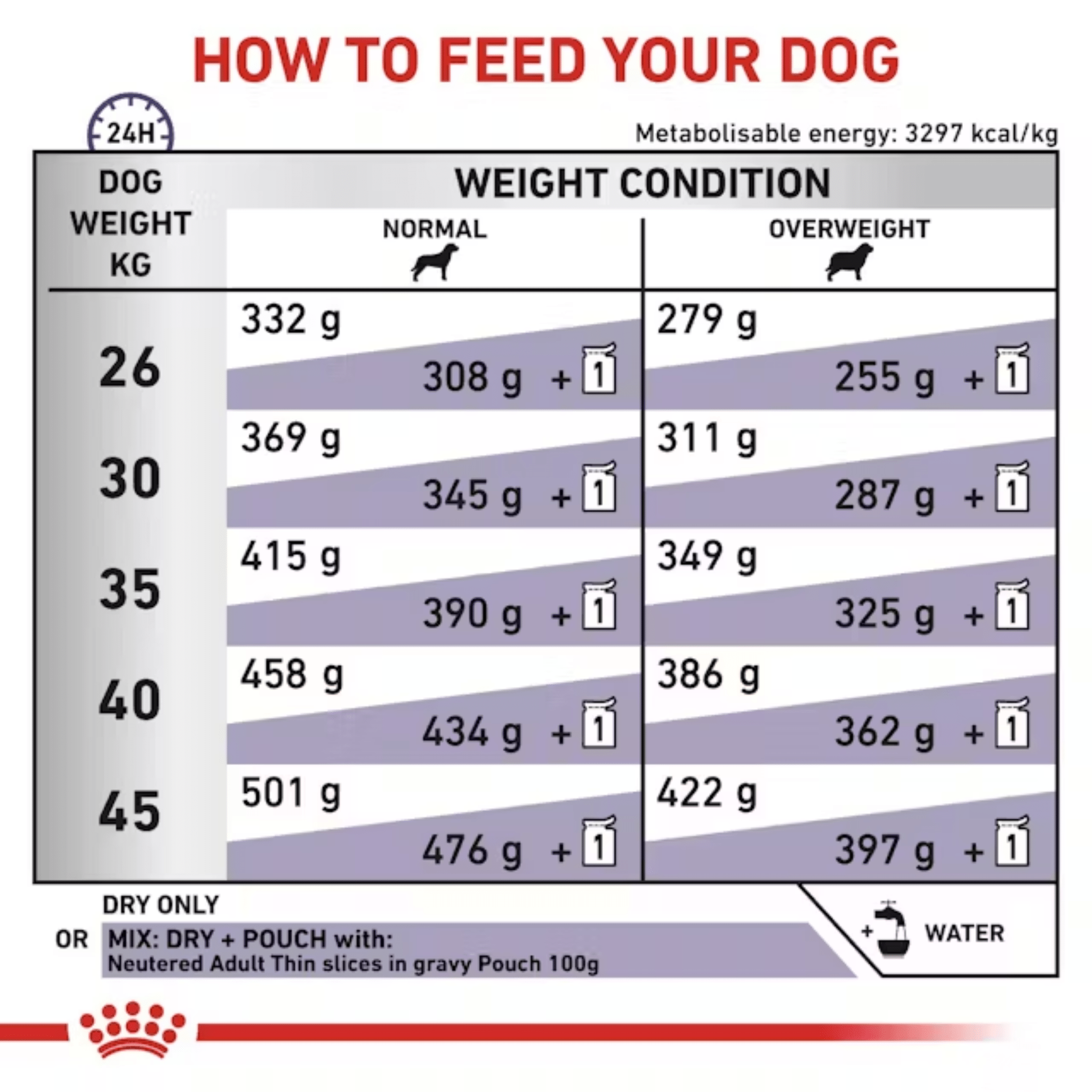 • Ideal bodyweight - Adapted formula and calorie level to help dogs maintain an ideal bodyweight. A blend of fibres help to promote the feeling of fullness.