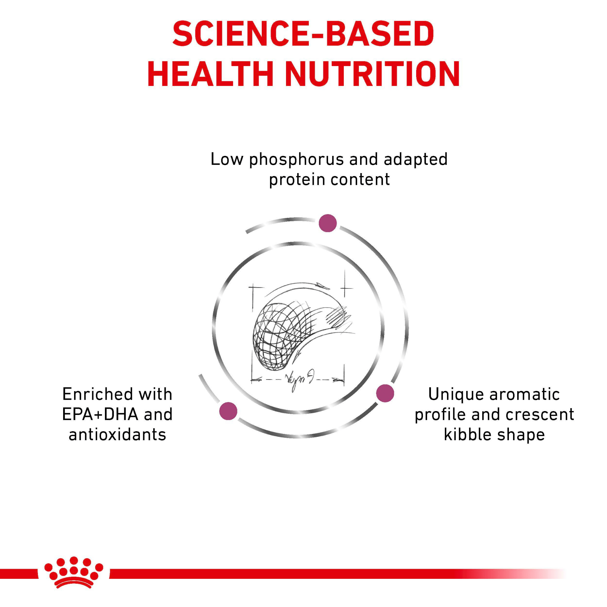Formulated with low phosphorus and moderate protein of high quality to support renal function. Adapted energy content to reduce meal volume and help support a reduced appetite. A specific aromatic profile with a dedicated texture to help stimulate the dog’s appetite, particularly in cases of food aversion.