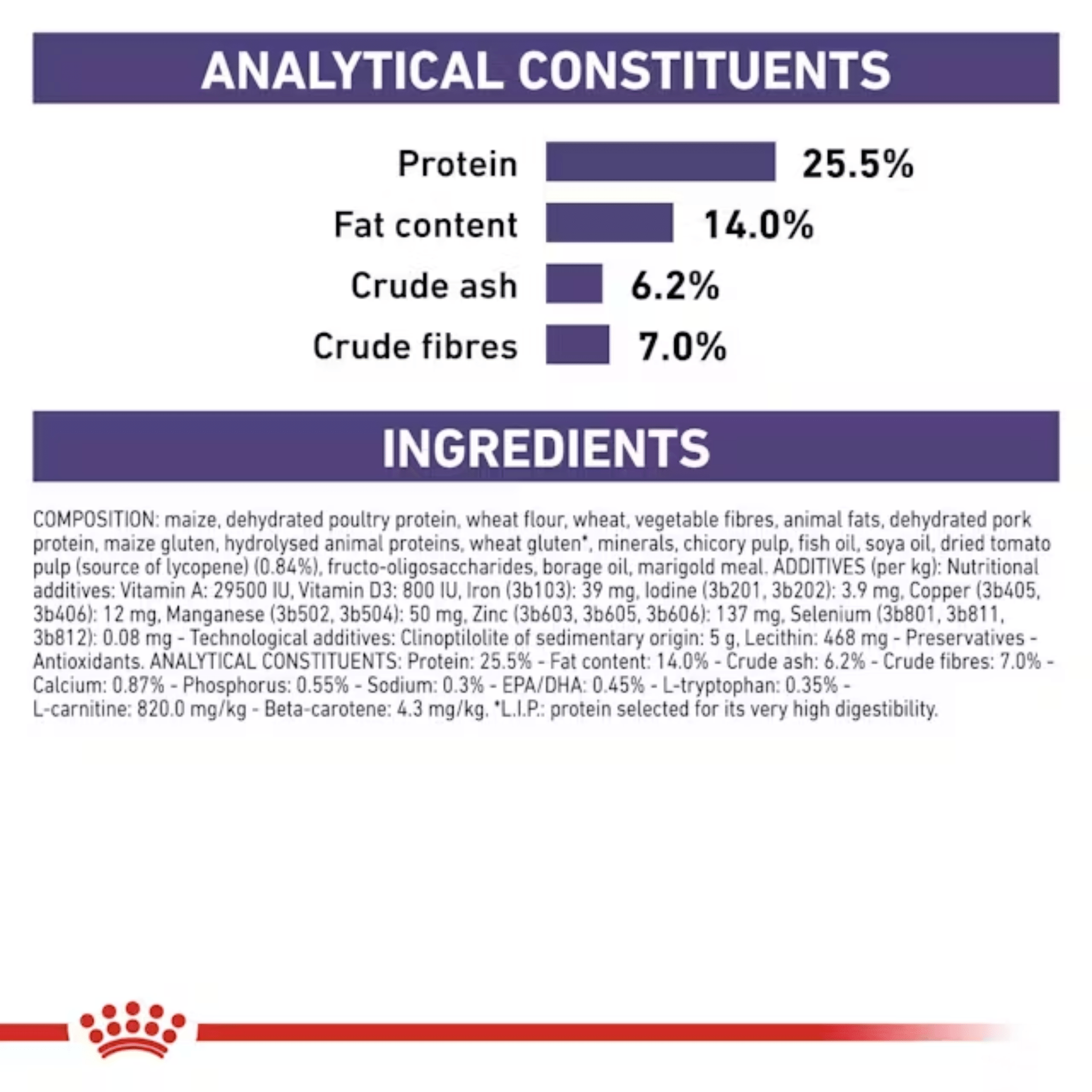 Composition: Maize, dehydrated poultry protein, wheat flour, wheat, vegetable fibres, animal fats, dehydrated pork protein, maize gluten, hydrolysed animal proteins, wheat gluten*, minerals, chicory pulp, fish oil, soya oil, dried tomato pulp (source of lycopene) (0.84%), fructo-oligo-saccharides, borage oil, marigold meal.