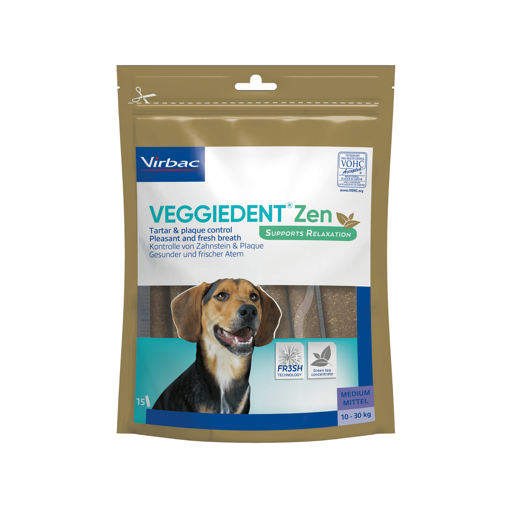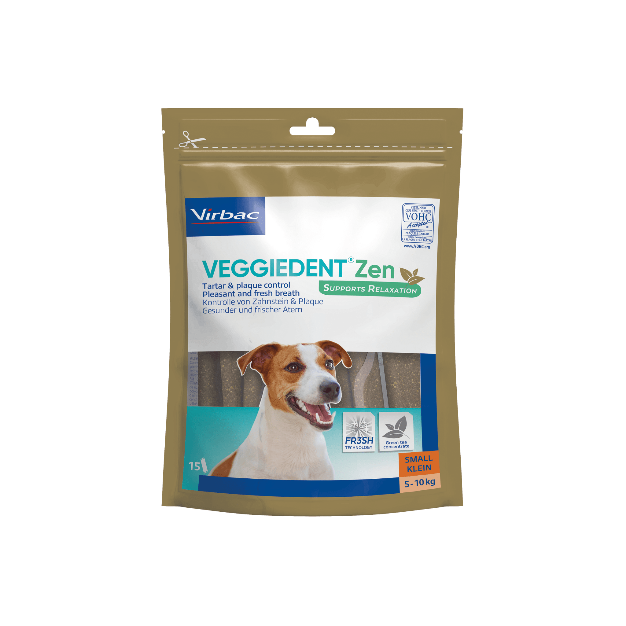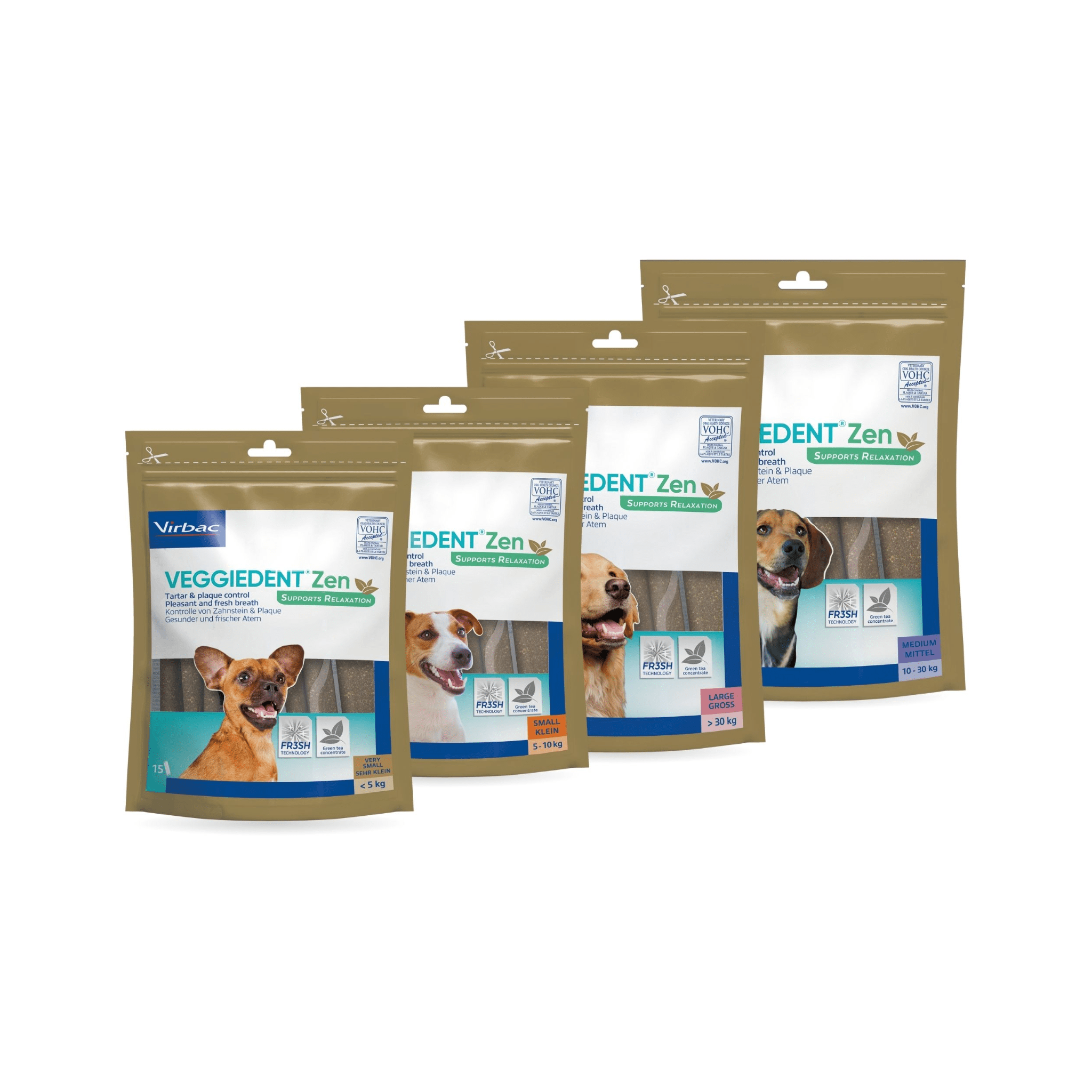 VeggieDent® ZEN Dental Chews also feature triple-action FR3SH™ Technology to help freshen breath and fight plaque.